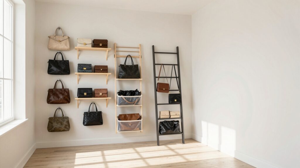 Walls are basically blank canvases waiting to hold your bag collection. You’ve got tons of vertical space you’re probably not using, and hanging shelves solve that problem perfectly. Floating shelves, metal brackets, and wooden planks work great as hanging shelf materials for displaying your bags attractively. DIY shelf installation isn’t complicated, you’ll just need a level, drill, and wall anchors. Start by measuring your wall space, then mark where you want shelves positioned. You can space them about twelve to eighteen inches apart, giving you flexibility for different bag sizes. Like vertical shelving units, hanging shelves maximize wall height for storage while improving accessibility and maintaining a cohesive look. This approach keeps your bags organized, visible, and completely off your floor.